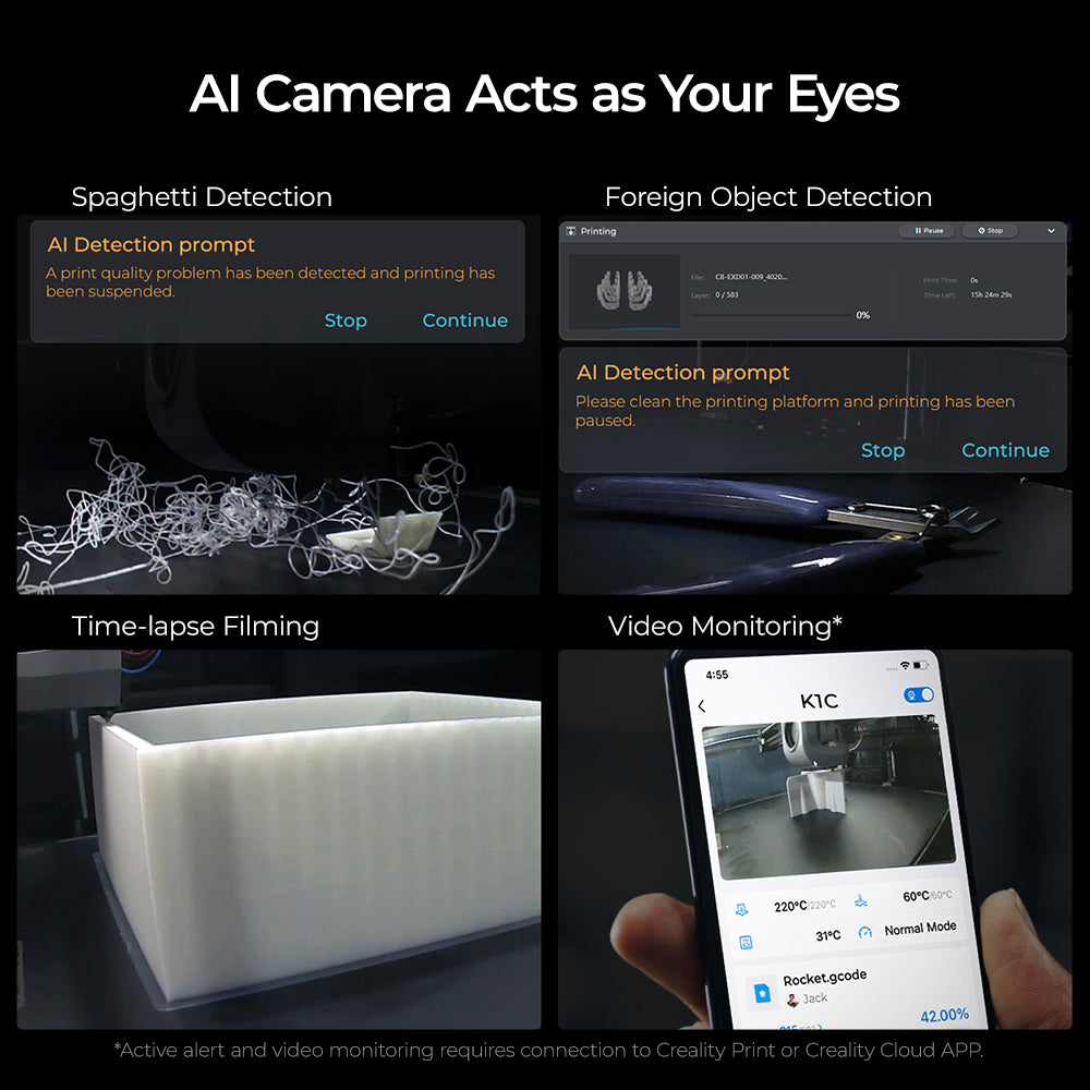 | سنسورهای هوشمند | سنسور اتمام فیلامنت، ادامه چاپ پس از قطع برق، دوربین هوشمند AI، نورپردازی داخلی، حالت Sleep |