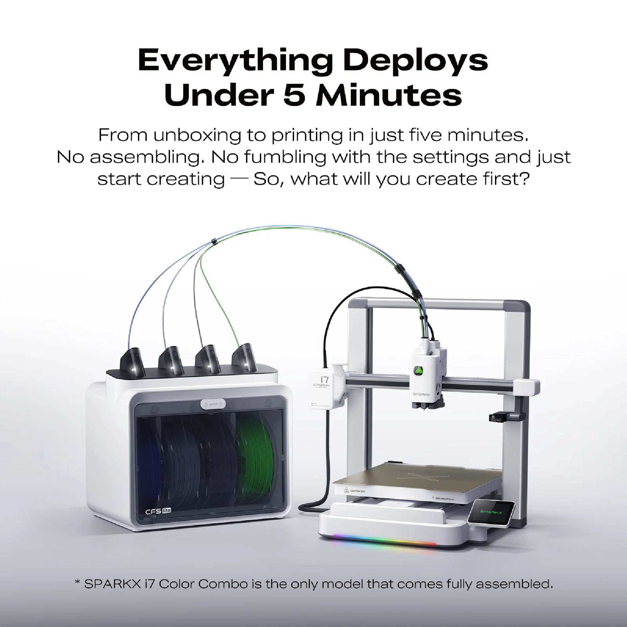| محتویات جعبه | پرینتر SPARKX i7 (یا Color Combo / Autofill Combo)، CFS Lite یا CFS Mini در صورت سفارش، بستهی ابزارهای جانبی، کابلها و دفترچه راهنما |