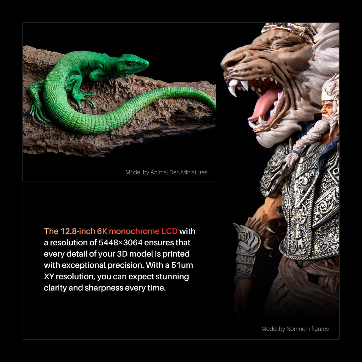 ۲. رزولوشن 12K و دقت بینظیر: این پرینتر مجهز به یک صفحه LCD مونوکروم 10 اینچی با رزولوشن چشمگیر 12K (11520×5120 پیکسل) است. این رزولوشن بالا، دقت X/Y باورنکردنی 19 میکرومتر را ارائه میدهد که به معنای بازتولید جزئیات فوقالعاده ریز و سطوح صاف و یکدست است. خطوط لایه تقریباً نامرئی شده و مدلهایی با کیفیت حرفهای خواهید داشت.