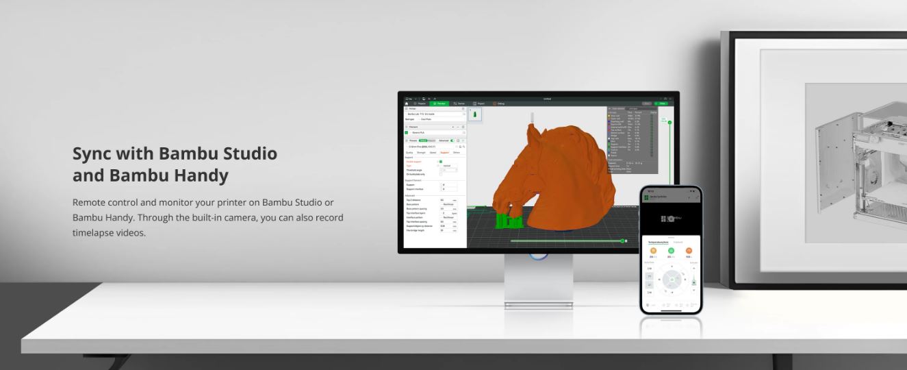 پرینتر bambu lab P1S قابلیت چاپ مواد PLA, PETG, TPU, PVA, PET, ABS, ASA,PC,PA را دارد.این پرینتر دارای فن خنک کننده 12 واتی نیز هست.این پرینتر مجهز به سیستم ارتباطی از طریق WiFi است و شما میتوانید مدل های خود را از طریق تمامی دستگاه های هوشمند برای پرینت به پرینتر منتقل نمائید.در پرینترهای بامبو لب با نرم افزار اختصاصی Bambu Handy میتوانید با استفاده از تلفن همراه خود فرایند پرینت را کنترل کنید و با نرم افزار Bambu Studio تنظیمات ساده تر و بهتری را برای پرینت خود انجام دهید.