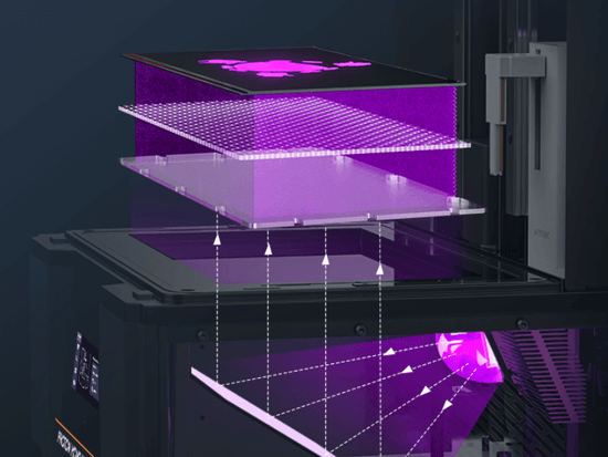 ۶. نوردهی یکنواخت و قوی: سیستم LightTurbo 3.0 با منبع نور COB (Chip-on-Board) و لنز فرسنل، نور UV را با یکنواختی بیش از 90 درصد به کل صفحه نمایش میرساند. این یکنواختی، تضمین میکند که هر نقطه از مدل به صورت یکسان پخت شود و در نتیجه مدلهایی با خواص مکانیکی ثابت و کیفیت بالا تولید شود.