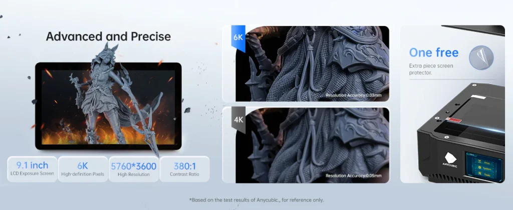 استفاده از صفحه تابش تک رنگ ۹.۱ اینچی با وضوح بالا 6k(۳۶۰۰×۵۷۶۰) پیکسل جزییات واضح و ظریف تری را ارائه میدهد که با نسبت کنتراست بالا ۳۸۰/۱ تضمین کننده کیفیت پرینت میشود.